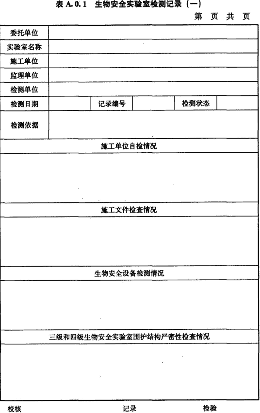 A.0.1 生物安全实验室施工方自检情况、施工文件检查情况、生物安全柜检测情况、围护结构严密性检测情况应按表A.0.1进行记录。