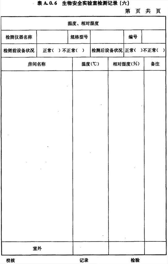 A.0.6 生物安全实验室房间温度、相对湿度的检测应按表A.0.6进行记录。
