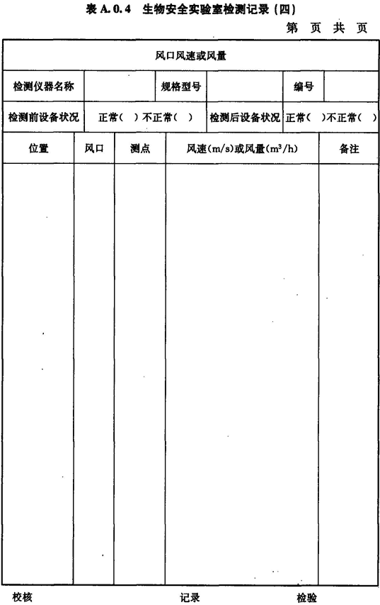 A.0.4 生物安全实验室风口风速或风量的检测应按表A.0.4进行记录。