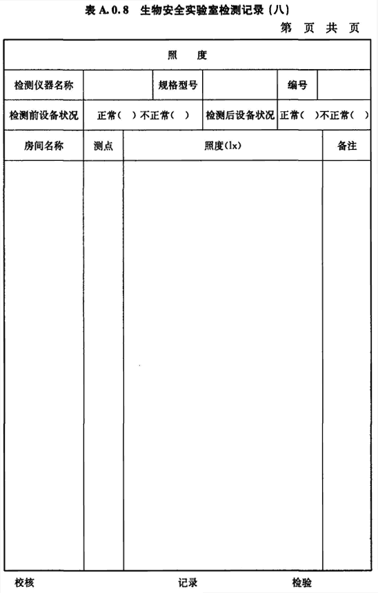 A.0.8 生物安全实验室房间照度的检测应按表A.0.8进行记录。